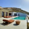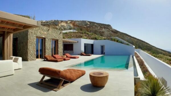 Вилата на плажа вклучува седум спални соби, винарска визба, комплетно опремена теретана и два базени. Во уникатниот кикладски пејзаж на Миконос, камената пештерска вила...