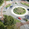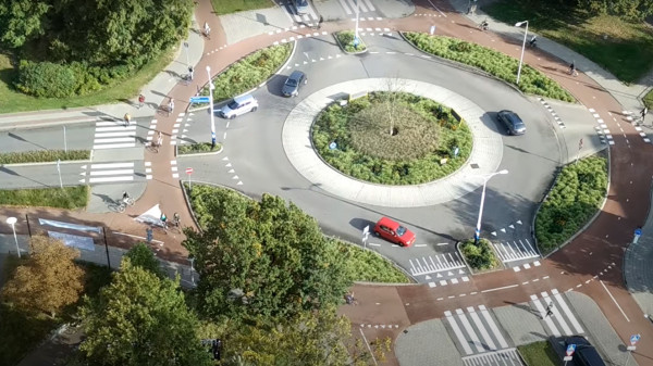 Велосипедистите на вакви кружни текови имаат свој надворешен прстен обоен со контрасна кафено-црвена боја, со велосипедски премини преку секој од четирите пристапни патишта. Тука...
