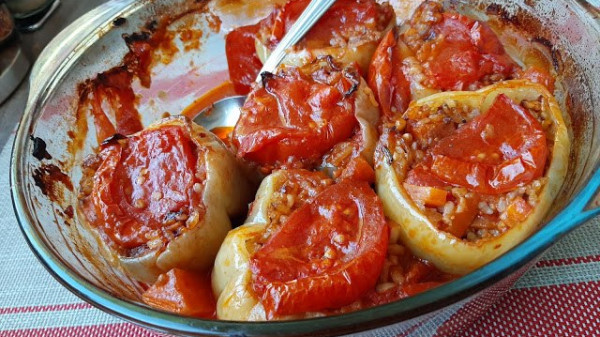 СОСТОЈКИ: 7 пиперки 100 гр ориз 4 лажици сецкани ореви 1 морков 1 кромид или праз 1 поголем домат 100 ml варени домати сув...