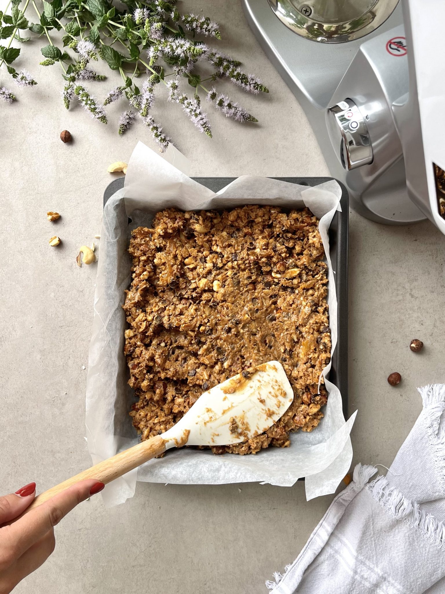 Слатката и здрава смеса ставете ја во плех обложен со мрсна хартија, израмнете ја и добро притиснете ја со лажица, чаша или сукало. Ставете сè во фрижидер најмалку половина час, а потоа исечете ги готовите плочки во саканите форми. Напорот е минимален, а на децата ќе им се допадне резултатот. Можете да ги завиткате плочките во хартија за печење и да ги зачувате за децата да ги имаат како ужина во парк, градинка или училиште. Задолжително оставете неколку парчиња за себе – за пауза помеѓу состаноците, кога ќе ви падне нивото на енергија.