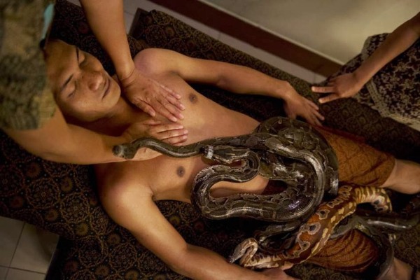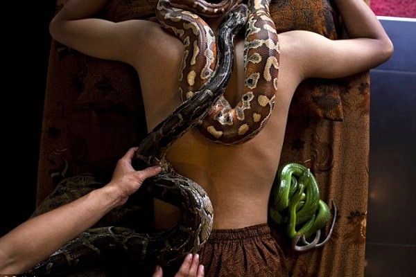 Според изворите, живи змии лазат по грбот и лицата на луѓето, што во голема мера придонесува за релаксација и наводно ослободување на болка, но пред сè за внесување на голема доза на самодоверба на крајот од сесијата. Еден од клиентите кој направил масажа со змија, изјавил: „Откако змиите беа ставени на мојот грб, почнав да чувствувам олеснување и опуштање на мускулите. Иако сум човек кој многу се плаши од самата помисла на змии кои се шират низ моето тело, стравот, нервозата и напнатоста одеднаш исчезнаа и целото искуство ми овозможи чувство на дополнителна самодоверба и физичко подмладување“.