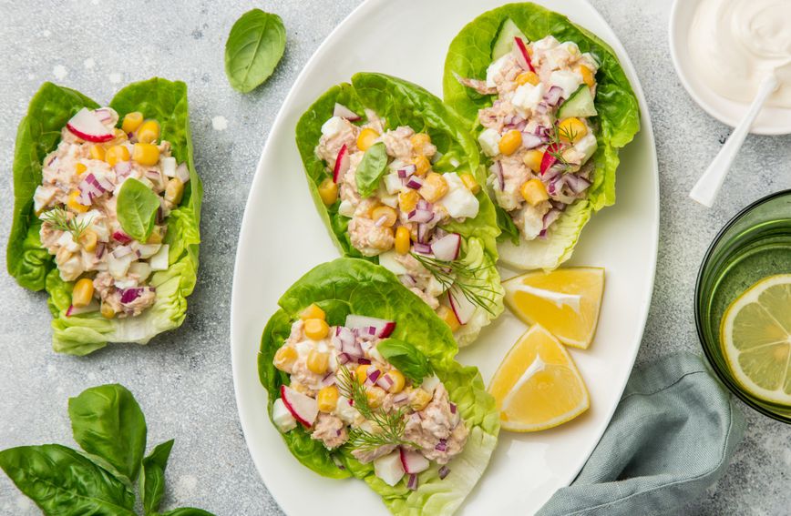 Наместо туна, можете да користите грав, наут или слични конзервирани мешунки кои не бараат термичка обработка. Крцкавите каснувања од зелена салата може да се зачинат со мексиканска салса и да се украсат со сос од гуакамоле или само свежо авокадо. Ова е рецепт во кој можете да додадете зеленчук по избор кој моментално го имате во фрижидер, како домати, пиперки, моркови, стебленца целер и слична храна.