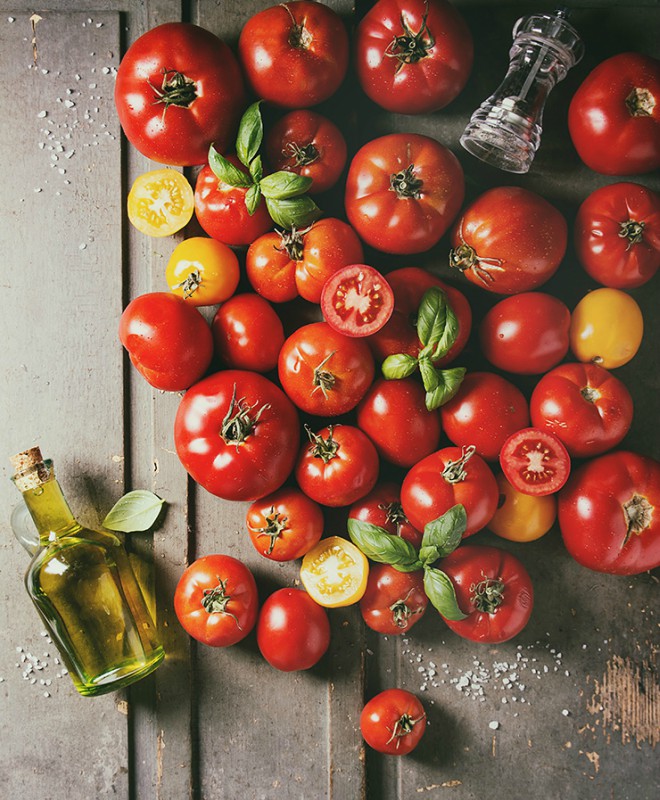 Доматот, како и многу други црвени овошја и зеленчуци, е збогатен со ликопен (ова е главната компонента што ја одредува бојата на овошјето). Ликопенот има позитивен ефект врз целото тело, го стимулира производството на колаген и помага во борбата против ултравиолетовата светлина. Храната што ја содржи оваа супстанца најдобро се јаде со здрави масти, како што е маслото од авокадо.
