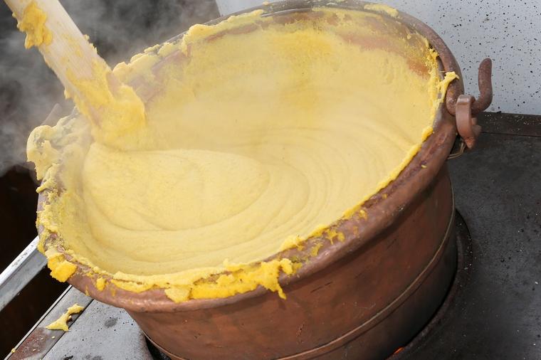 - Ставете вода да зоврие, додадете сол, маснотии и со брзо мешање (за да не се формираат грутки) додадете брашно од пченка.