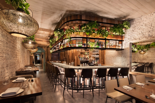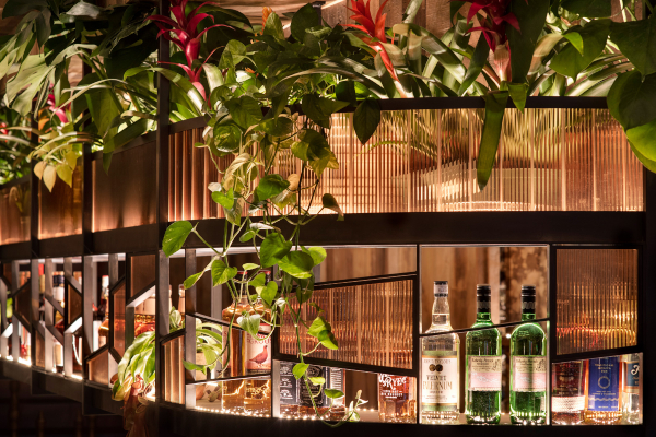 Областа на барот има тиковни панели и мраморни мермерни плочки. Систем на полици исполнети со шишиња пијалоци и бујни растенија се спушта од таванот. Некои делови од него се отворени, додека други се покриени со чаша во боја на килибар.