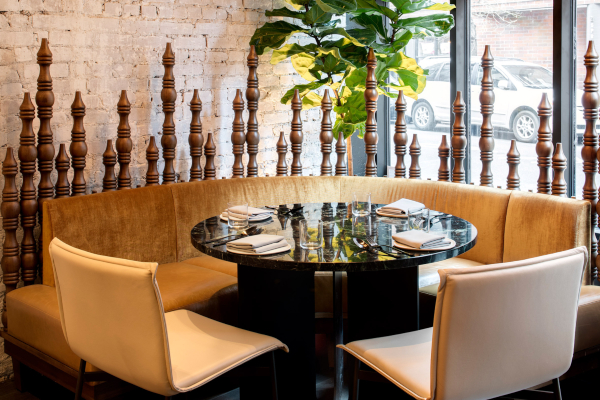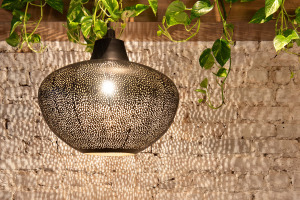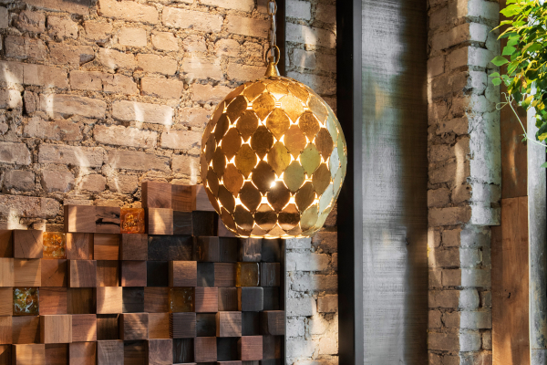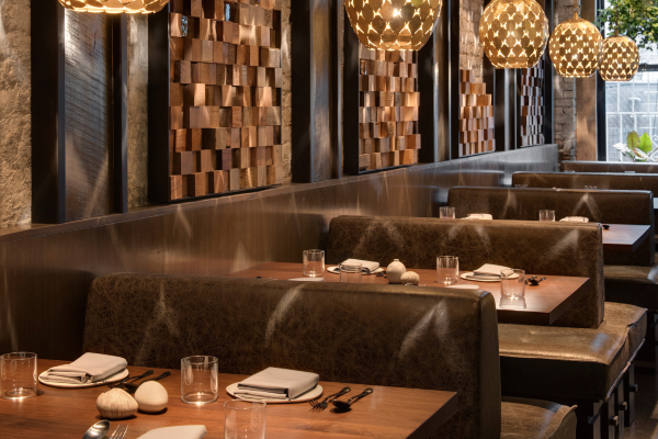 Златни, обемни лустери висат над дрвени маси и банкети, за да се охрабри создавање порелаксиран амбиент.