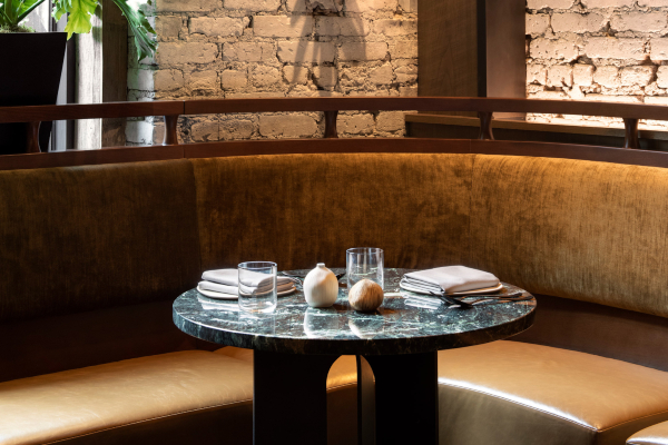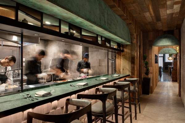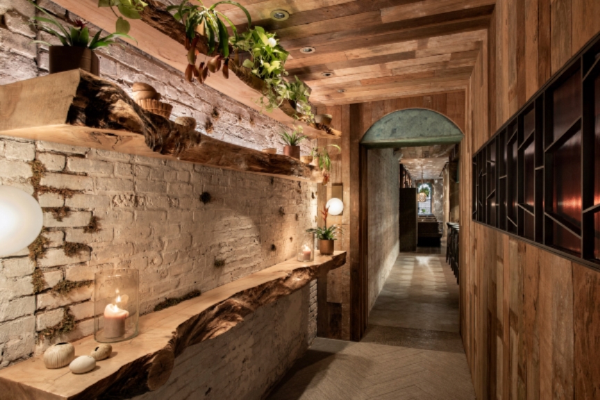 По пристигнувањето, гостите влегуваат во влезната соба со дрвен таван и ѕидови од тули, кои се наредени со млечни тонови. Дрвените маси се спарени со окери кожни столици, додека перфорираното осветлување фрла светлина на sидовите и масите.