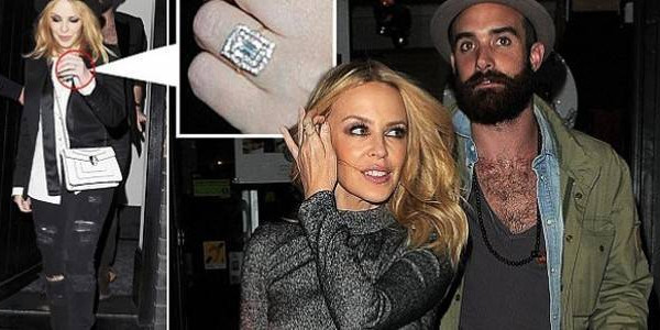 Пејачката Кајли Миног (47) во Лондон го покажа големиот дијамантски прстен со што ги поттикна гласините дека се свршила со 20 години помладиот актер...