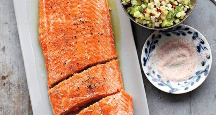 Време на подготовка: 20 минути / ќе послужите: 6 1 страна од лосос, препорачливо без кожа (1 килограм) 3 лажичка маслиново масло Крупна сол...