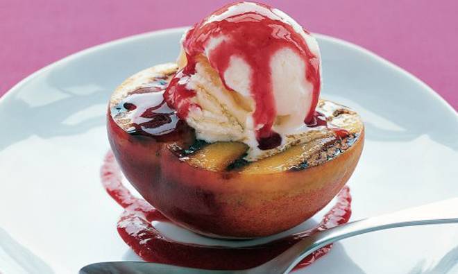 Две големи праски 2 лажици путер 4 лажички кафеав шеќер 300 грама малини Сладолет (по ваша желба, препорака ванила) Чекор 1 Загрејте ја електричната...
