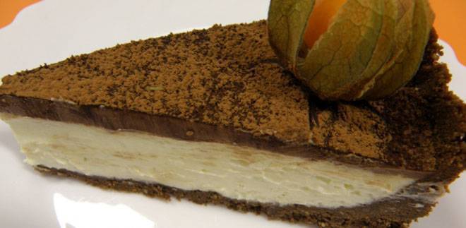 Потребни намирници: За кора: 2 пакетчиња бискивити со какао 150 гр путер 150 гр печени и лупени бадеми За белиот крем: 1 кутија сирење...
