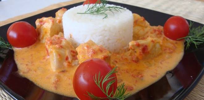 Потребни состојки: 600гр пилешко бело месо 3 големи свежи црвени пиперки 1 кромид 2дл. слатка павлака 2дл. вода 3 лажици масло сол бибер Начин...