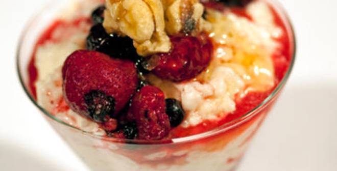 Потребни состојки: 200гр ориз 500мл млеко 500гр малини 100гр мед 60гр бадеми Начин на подготовка: Млекото и оризот ставете ги да се варат на...