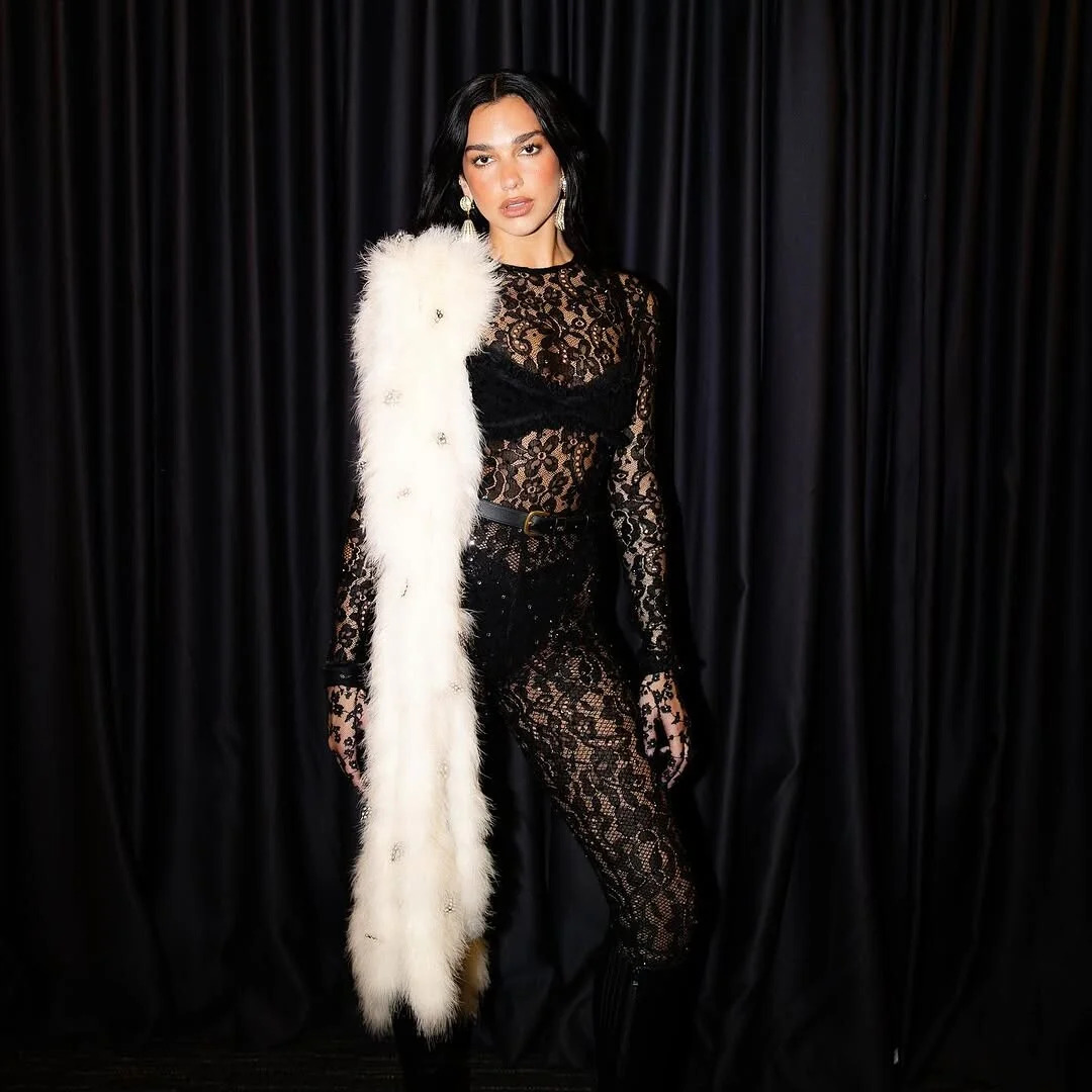 Дуа Липа во чипка од глава до пети: Припиен проѕирен комбинезон кој ѝ ги истакна облините
