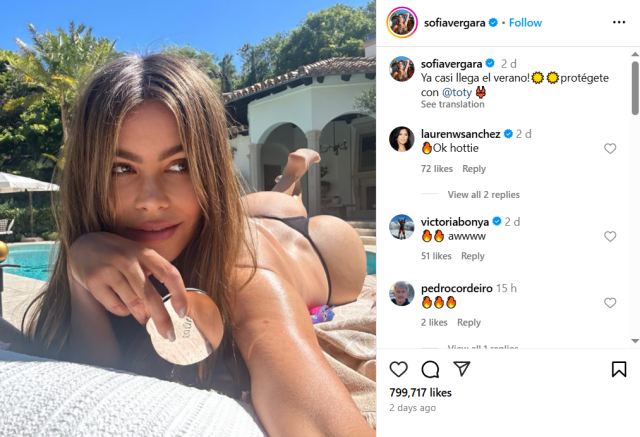 Атрактивниот изглед на Софија Вергара ги поместува границите и ги руши сите предрасуди, а речиси секоја нејзина објава на социјалните мрежи покажува колку луѓето се воодушевени од изгледот на убавата актерка.
