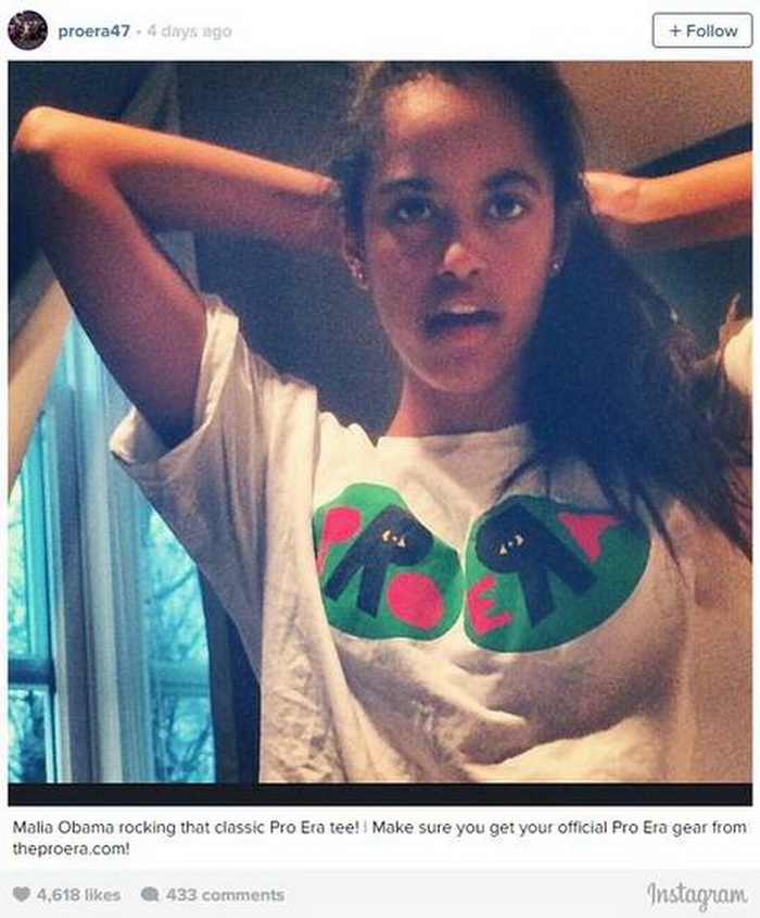 На фотографијата се гледа како 16-годишната Малија позира во маица од бруклинскиот хип-хоп колектив “Pro Era”, а оваа фотографија била поставена на нивниот профил на Инстаграм.