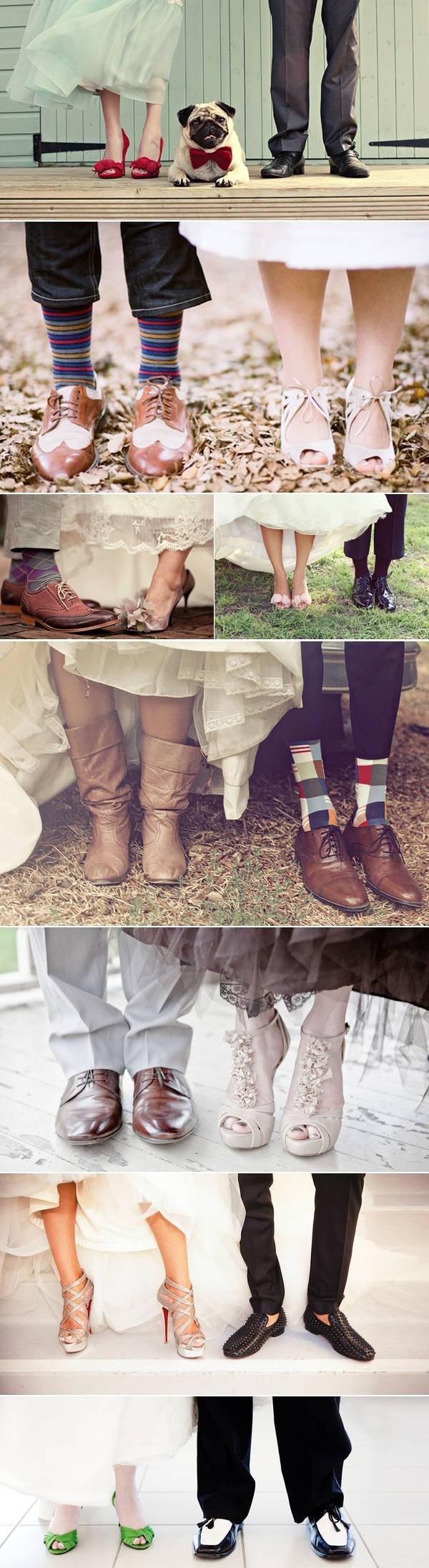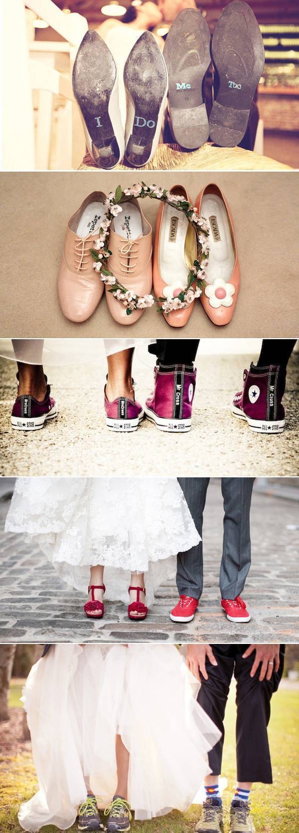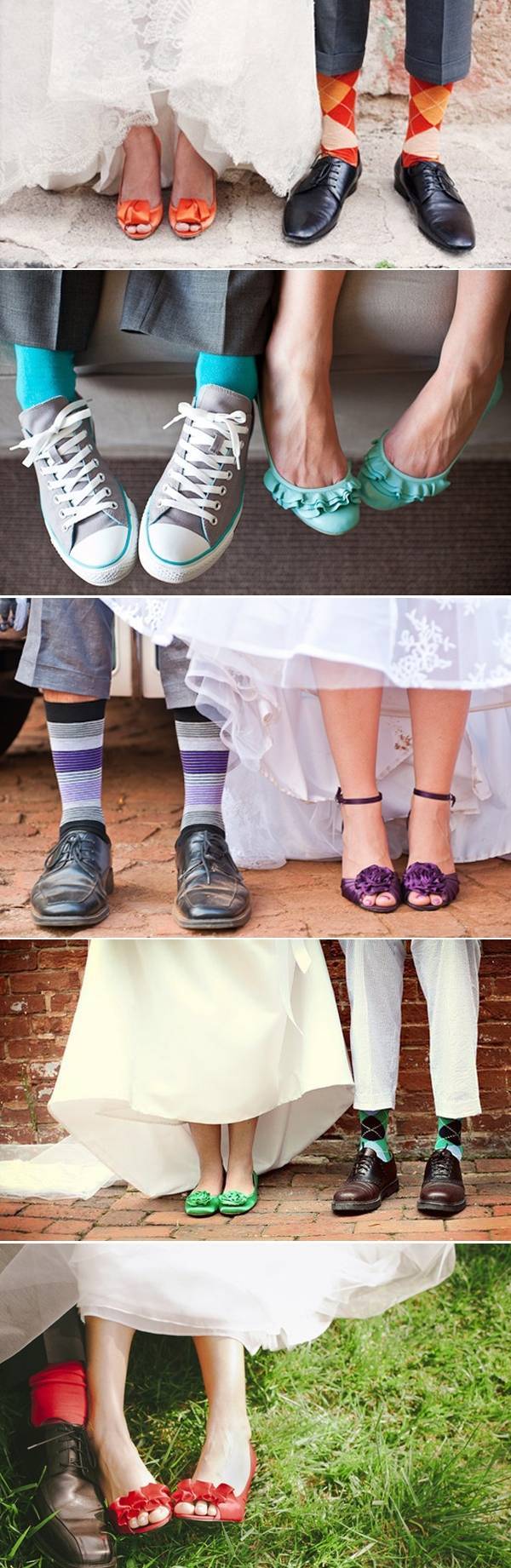 Венчавката е славење на љубовта помеѓу невестата и младоженецот, па зошто да не ја покажете и вашата взаемна креативност преку свадбената облека. Дали можеби е добра идеја да изгледате компатибилно од глава до пети со вашиот партнер? Често пати, малите детали се она што прават голема разлика, па зошто да не бидете креативни и да направите паметна одлука кога ги одбирате вашите чевли. Видете ги овие прекрасни комбинации и испланирајте како да ја искомбинирате вашата креација.