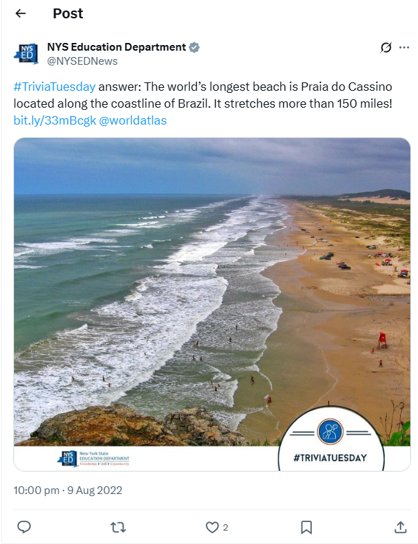 Pixsell објави листа на најдолги плажи во светот. На прво место е плажата Praia Do Cassino, вистинско географско чудо. Се протега долж брегот на Атлантикот на 254 километри. Бескрајното песочно пространство од песок е глетка која е неверојатна додека океанската вода се меша со песокот.