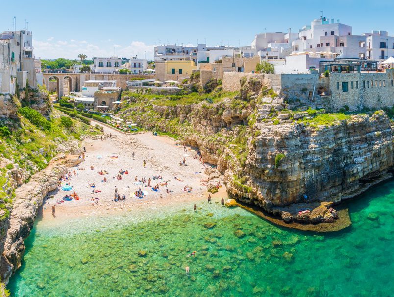 Малиот град Полињано а Маре, познат и како „Бисер на Јадранот“ се наоѓа на карпа од варовник што излегува од океанот – тоа е едно од најромантичните места во цела Апулија. Поминете го денот истражувајќи ги неговите песочни заливи и заливи со брод или едноставно изгубете се во кривулестовите, бели улици на градот.