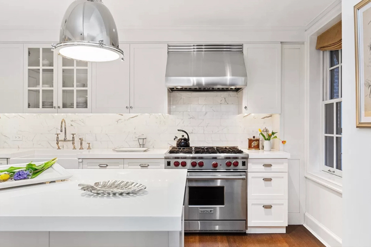 Дизајнерката на ентериер Анабел Селдорф создаде кујна и трпезарија со отворен план, што овозможува непречен проток меѓу просторите. Кујната вклучува централен остров, доволно простор за кабинети, како и апарати од висока класа. Преку ходникот има дневна соба со голем камин опкружен со класични бели полици.