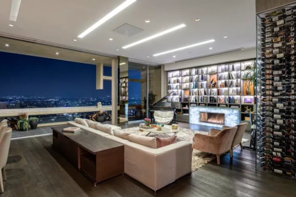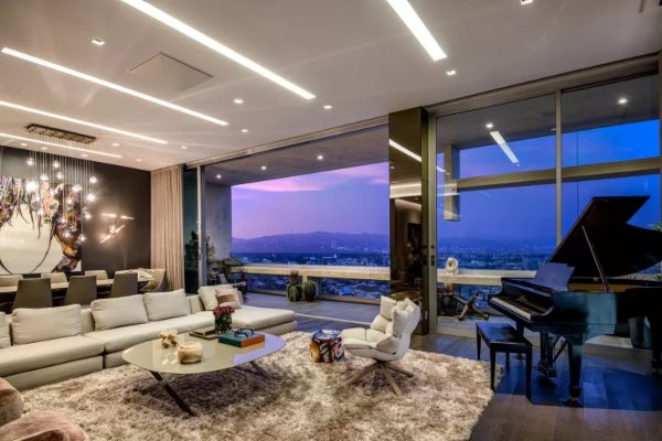 Дневната соба со отворен план има прозорци од подот до таванот со прекрасен поглед на хоризонтот во Лос Анџелес. Дневната соба има пијано и удобен мебел, совршен за врвни забави.