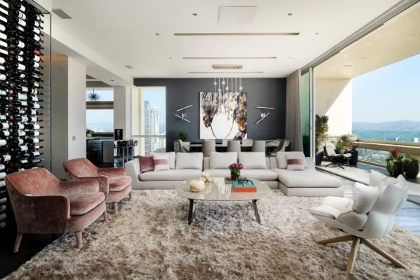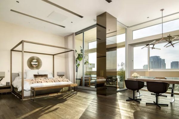 Станот се наоѓа на горниот кат од архитектонското ремек-дело со целосна услуга IM Pei и има 320 квадратни метри простор за живеење. Зрачи со луксуз, со атрактивни бушави теписи, кадифени фотелји и дела на современа уметност.