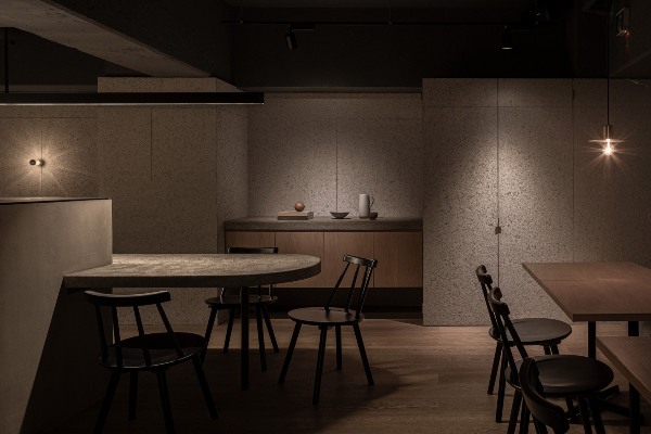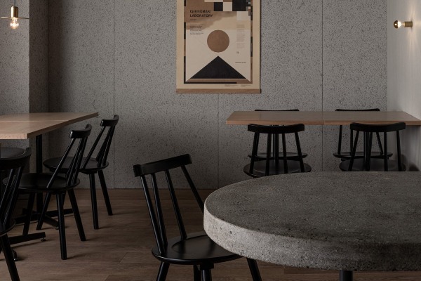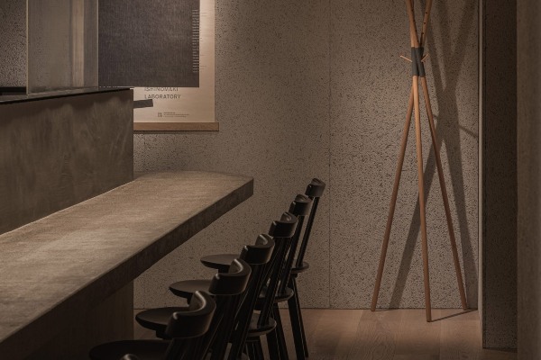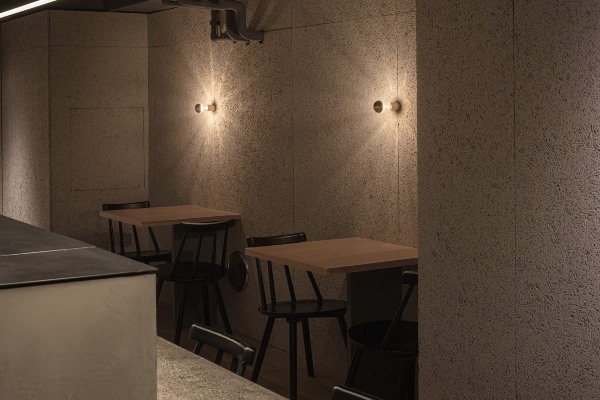 Тенка, долга челична висечка лампа го наоѓа своето место над бетонскиот шанк, создавајќи рамномерно осветлен амбиент. „Веруваме дека добрите ресторани можат да бидат домаќини на луѓе во различни ситуации – без разлика дали доаѓате сами, со пријатели, семејство, деловни партнери или на прв состанок. Затоа создадовме различни аранжмани за седење, со цел максимално да го искористиме расположивиот простор“, вели Ашизава.