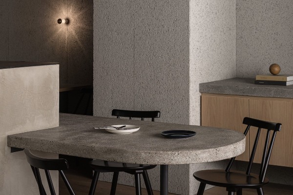 Тенка, долга челична висечка лампа го наоѓа своето место над бетонскиот шанк, создавајќи рамномерно осветлен амбиент. „Веруваме дека добрите ресторани можат да бидат домаќини на луѓе во различни ситуации – без разлика дали доаѓате сами, со пријатели, семејство, деловни партнери или на прв состанок. Затоа создадовме различни аранжмани за седење, со цел максимално да го искористиме расположивиот простор“, вели Ашизава.