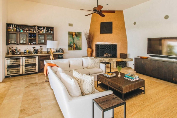 Како што можете да очекувате, хациендата е дизајнирана да го нагласи начинот на живот што се одвива во внатрешноста и надворешноста, буквално со секоја просторија што се отвора со тераса или балкон. Главниот апартман, како и дневната соба и домашната канцеларија се прелеваат кон дворот, кој доаѓа со бесконечен базен, џакузи и детски базен, кој се карактеризира со камен ѕид. Кујната во внатрешноста е доволно пространа за да забавува голем број луѓе и е опремена со најсовремени апарати. Дневната соба и трпезаријата уживаат во топлината на огништето, како и во близина на барот и прекрасната дрвена визба, така што не мора да одите ниту во некоја приватна визба за вино на сред оброк. Собите се прелеваат кон покриените ложи со поглед кон базенот и океанот.