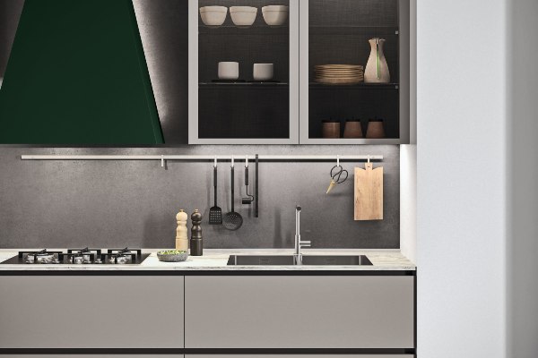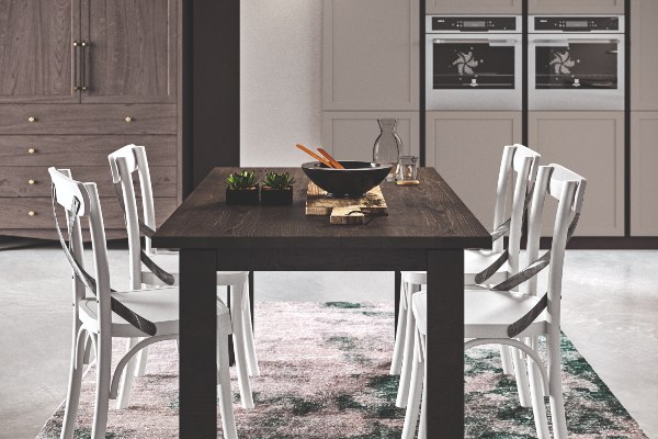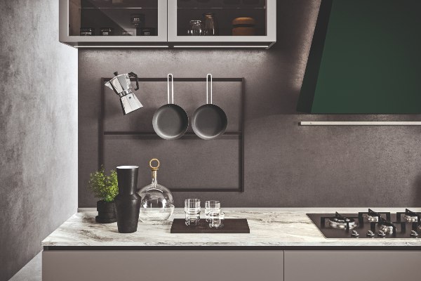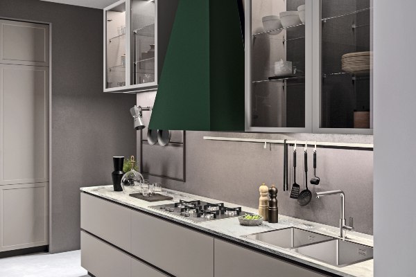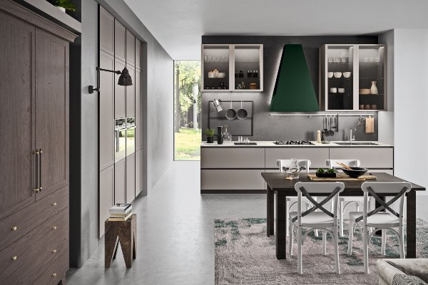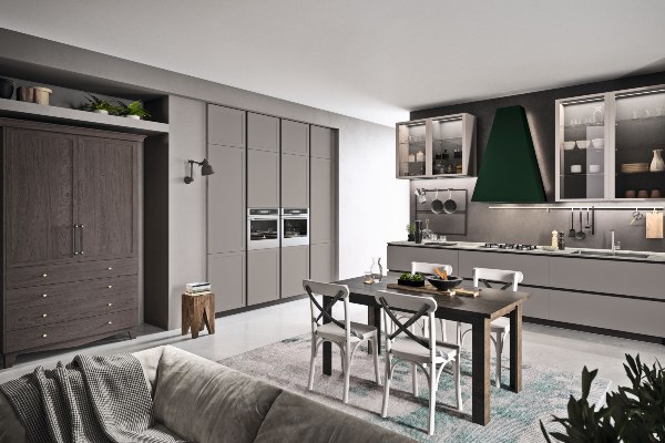 Составот во мат лакирана гулабна сива разновидност е совршен пример за оваа мешавина на стилови. Од една страна, наоѓаме модерни елементи, како што се совршено мазни основни врати на кабинетот во комбинација со лакирани стаклени sидни ормари: дизајнот е неопходен, линиите се екстремно чисти, а алуминиумското црно – исто така избрано за ѕидниот додаток Дама – дава допир на индустриски стил Од друга страна, столбовите со целосна висина во кои се наоѓаат кујнските апарати и оставата, чајната кујна даваат помодерен вкус; тука вратата создава рамка што „загрева“ и ги разубавува единиците, без да го комплицира амбиентот. Конечно, постојат елементи со класичен вкус, како што е амблемот на производството и занаетчиските капацитети на Rastelli: голема дабова дабова дилавато со две големи врати и четири фиоки, совршена за чување садови и алати, додавајќи допир на традицијата на целата приказна.