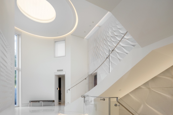 Главниот придонес на Заха Хадид во овој величествен проект е драматичниот ѕид што се протега по должината на главното скалило. Според агентите задолжени за продажбата на оваа вила, Хадид го надгледувала нејзиното позиционирање, со цел да се осигура дека ги исполнува нејзините високи стандарди, а има само два sида слични на овој во целиот свет. Во дневната соба можеме да видиме серија столови од Mercuric , кои исто така ги потпишува славниот архитект и кои можат да бидат дел од договорот за продажба, доколку потенцијалниот клиент се согласи со сегашните сопственици.