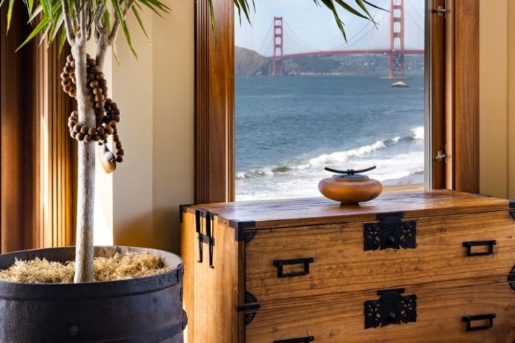 Пространите дневни соби и трпезарии, опремени со уникатна столарија, се поврзуваат со поинтимни простори, вклучувајќи удобна работна соба со камин и библиотека. Вилата има седум спални соби и осум бањи. Една од двете соби за гости има приватна сончева тераса со поглед на мирниот двор и иконскиот мост на Калифорнија Голден Гејт.