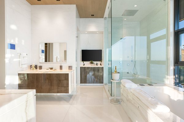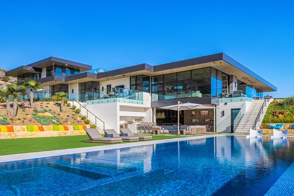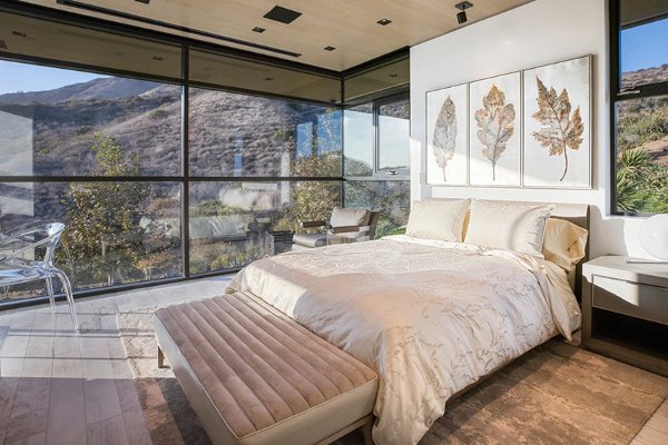 Покривајќи три нивоа, домот нуди пет спални соби и шест купатила, плус одвоена гостинска куќа со една спална соба која се издига над гаража со три автомобили. Подигнатата положба и стаклените ѕидови од подот до таванот му даваат најдобар поглед на имотот. Вистинско изненадување и задоволство е тоа што има приватна тераса на покривот во стил на летувалиште, заедно со шезлонги, бар, отворена кујна и скара.