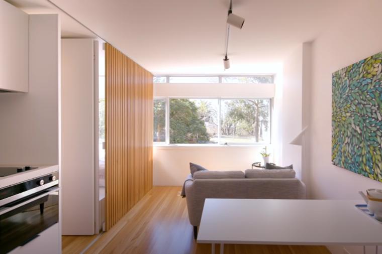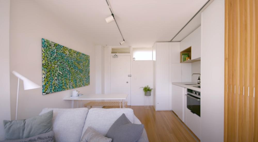 Кога ќе влезете во станот, на прв поглед се чини дека има дневна соба и кујна, но кога ќе го поместите екранот ќе видите дека зад неа се наоѓа мала спална соба со брачен кревет и гардеробер.