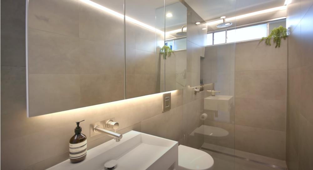 Бањата се наоѓа помеѓу кујната и спалната соба. За да изгледа визуелно поголемо, Бред користел големо огледало.