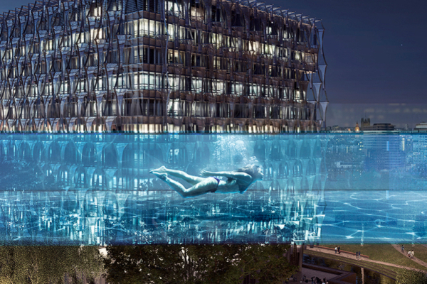 Сепак, за да се разликуваат од другите, кои упорно ги исполнуваат урбаните предели, некои од претприемачите кои работат на нив стануваат навистина креативни. Најновиот проект, кој е навистина невообичаен, може да се види во Лондон, каде пред само неколку дена е претставен најголемиот „лебдечки“ акрилен базен во светот.