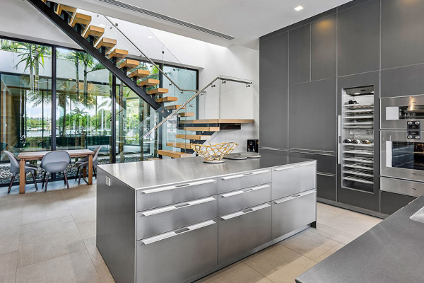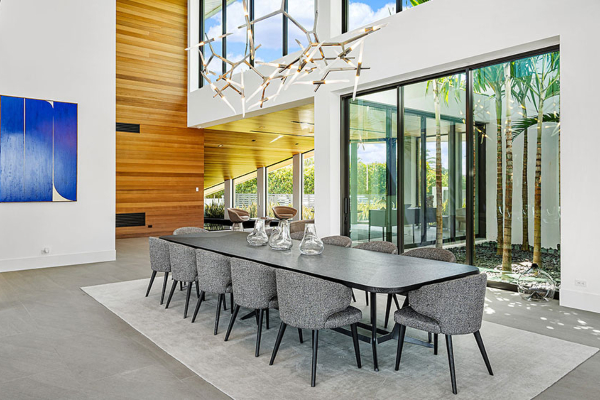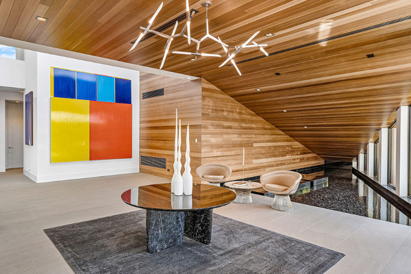 Главната дневна соба, од друга страна, максимално ја искористува убавината на глетката, па затоа содржи трпезарија во стилот на атриум, неформална семејна кујна со близначки острови и професионална кујна оддалечена малку подалеку.