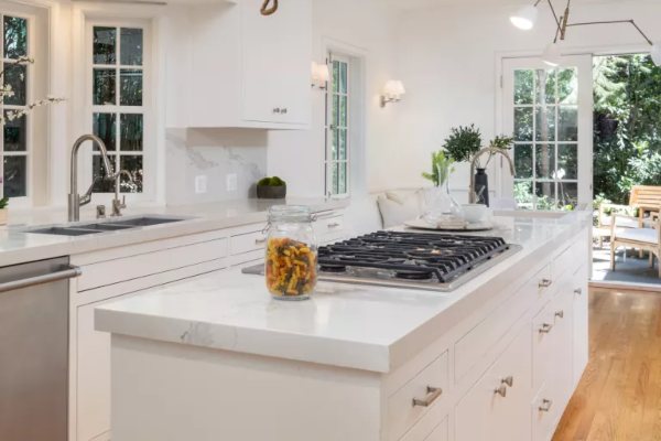Освен во станбениот дел, традиционалната шема продолжува во кујнскиот простор, кој комбинира мермерни тонови со суптилни дрвени нијанси натопени во сончевите зраци на Западниот брег.