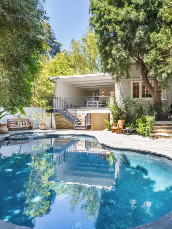 Одличната естетика продолжува и во бујното подрачје надвор од внатрешноста. Тука, покрај големиот базен, има комплет за јадење, крунисан со зелени нијанси на околните палми. Околните sидови и зелената жива ограда, исто така, нудат терапевтска приватност од метежот и вревата на градот на ангелите.