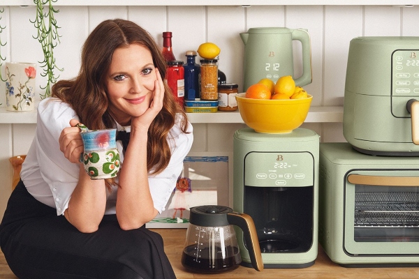 Познатата актерка, Дру Баримор, се здружи со Made by Gather’s Shae Hong за да дизајнираат заедно колекција на кујнски апарати со високи перформанси. Асортиманот е обоен во нијанса на жалфија, што дефинитивно ќе ја подигне естетиката на вашиот дом.