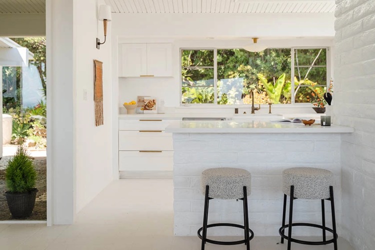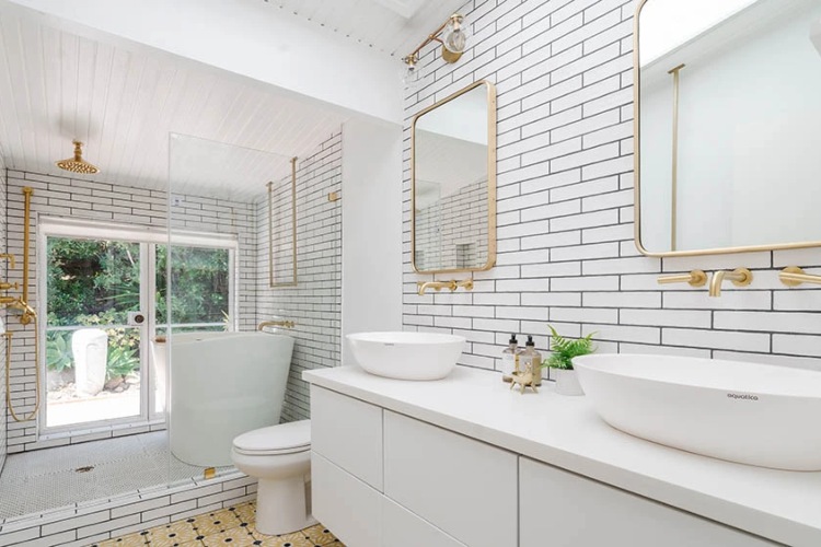 Кога станува збор за ентериерот, белите подови, тавани и ѕидови прават просторот да изгледа исклучително воздушен и светол. Ова чувство продолжува дури и во бањата, со бели плочки и златни акценти кои додаваат сјај.