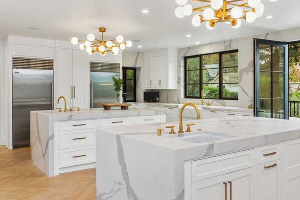 Тука е и гурманската, мермерна кујна со двојни острови, најсовремени апарати и банкет за појадок, нагласен со црни кожни седишта.