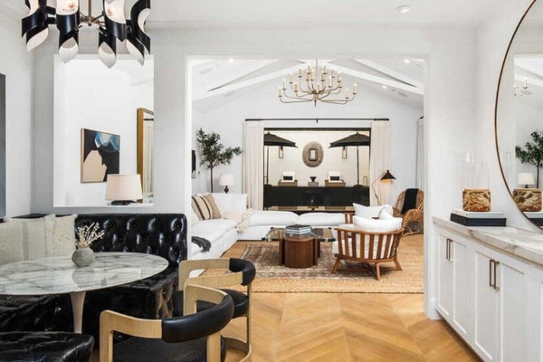 Безбедно скриена од уличните погледи од високи жива ограда, оваа вила има автомобилска патека што води до посебна гаража за два автомобила. Заоблениот сет скали ве води кон самата куќа, која има модерна бела фасада, наспроти црниот метален покрив и работ. Кога влегувате внатре, се создаваат модерни, но истовремено и традиционални ентериери како почит кон модерниот стил на фармата, користејќи план за отворен простор, нагласен со бели, француски дабови подови.
