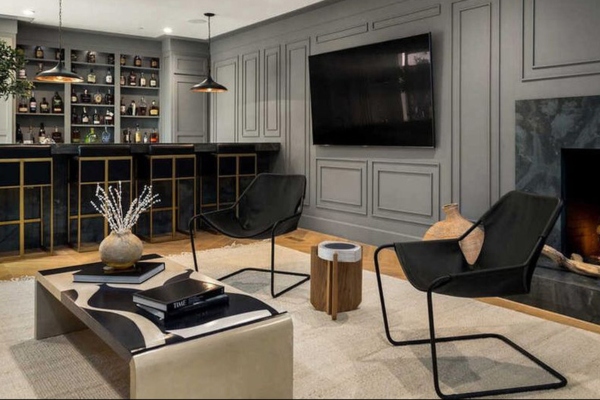 Стаклената влезна врата се отвора кон фоајето што гледа кон централниот двор со тераса ал фреско, базен и спа дел, вип ложа и камперски оган. На главното ниво има дневна соба со камин и прозорци од подот до таванот што се отвораат кон надворешноста, со бар и интимна семејна соба.