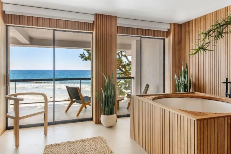 Спалната соба на долниот кат вклучува бања со дрвени облоги и приватна тераса со поглед на океанот.