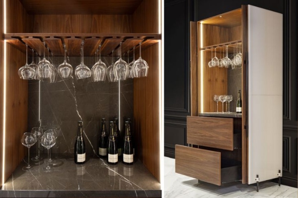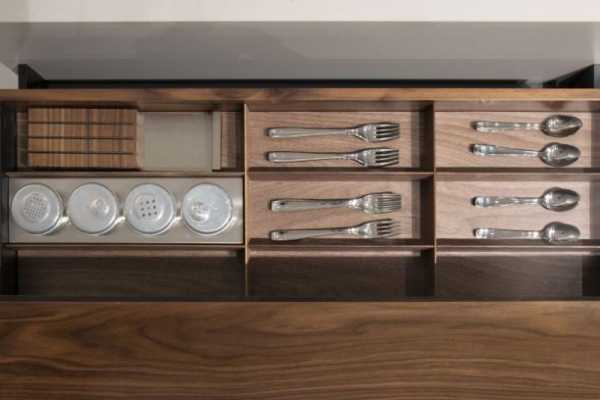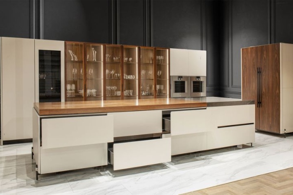 Кујната V888 е целосно изработена по мерка – неговите елементи имаат далечински управуван механизам што ја поместува горната површина од Canaletto костен и Persian Grey мермер. Страните на елементите се карактеризираат со кожа, додека предниот дел има лакирани фиоки и титаниумски финиш на ногарки.