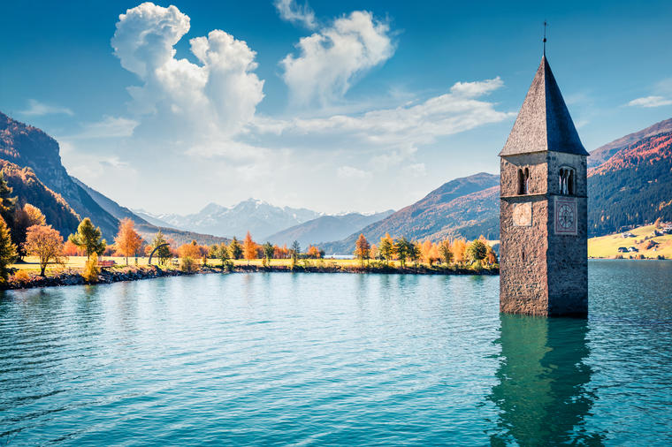 Вештачкото езеро Ресија се наоѓа во Јужен Тирол, на северот на Италија, а е изградено во 1950 година.