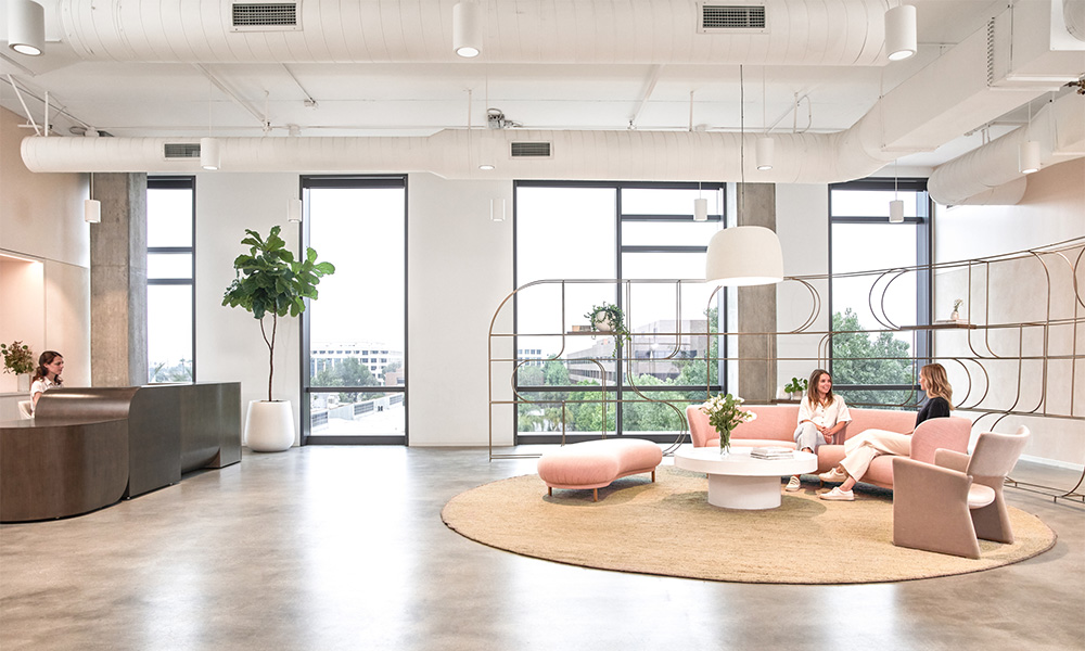 Во просторот за прием, има масивен дрвен шалтер со неправилна форма дизајниран од Raptи изработен од компанијата ArtCrafters од Лос Анџелес. Розовиот кауч е местото каде што посетителите чекаат ред за состанок, а сè е затворено со кружен метален панел направен од Bayly Art.