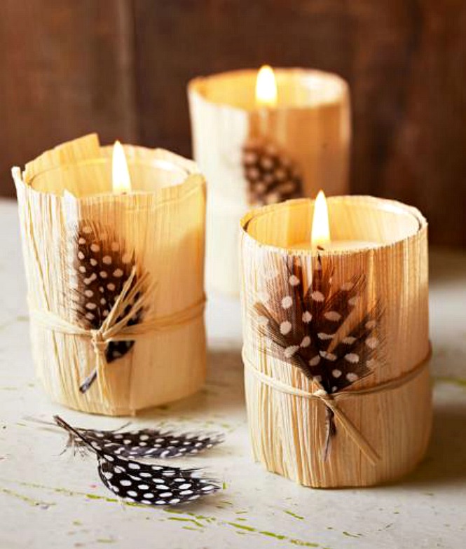 Завиткајте чаша или стаклени свеќници во суви листови од пченка или некое друго растение. Завиткајте ја рафијата околу свеќникот неколку пати, за да ги прицврстите листовите на растението. На крајот ставете пердув и ќе ги воодушевите сите гости и домаќинство со вашата декорација.