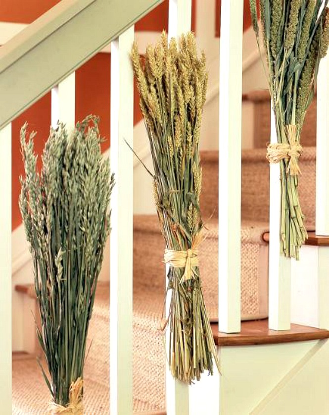 Внесете ги сноповите жито во куќата и закачете ги на ѕидовите или на оградата на скалите. Соберете снопови украсна трева или жито и исушете ги. Потоа направете снопови и врзете ги со панделка или рафија (лента направена од лисја од разни растенија).